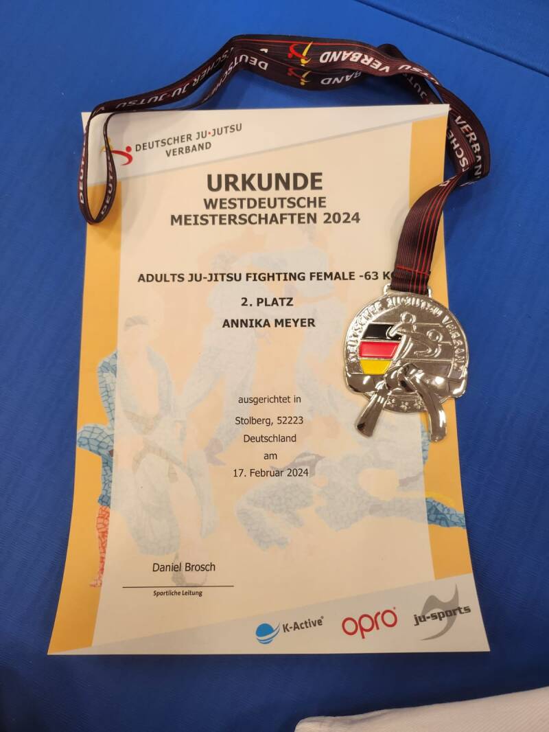 Bei den Westdeutschen Meisterschaften im Ju-Jutsu konnte Annika Meyer letzte Woche gleich zwei Medaillen abräumen. Im Fighting wurde sie Zweite in ihrer Gruppe und konnte sich somit die Silbermedaille sichern. Noch besser lief es im BJJ. Dort konnte Annika noch eine Schippe drauflegen und sich den Titel der westdeutschen Meisterin erkämpfen. Wir gratulieren herzlich!