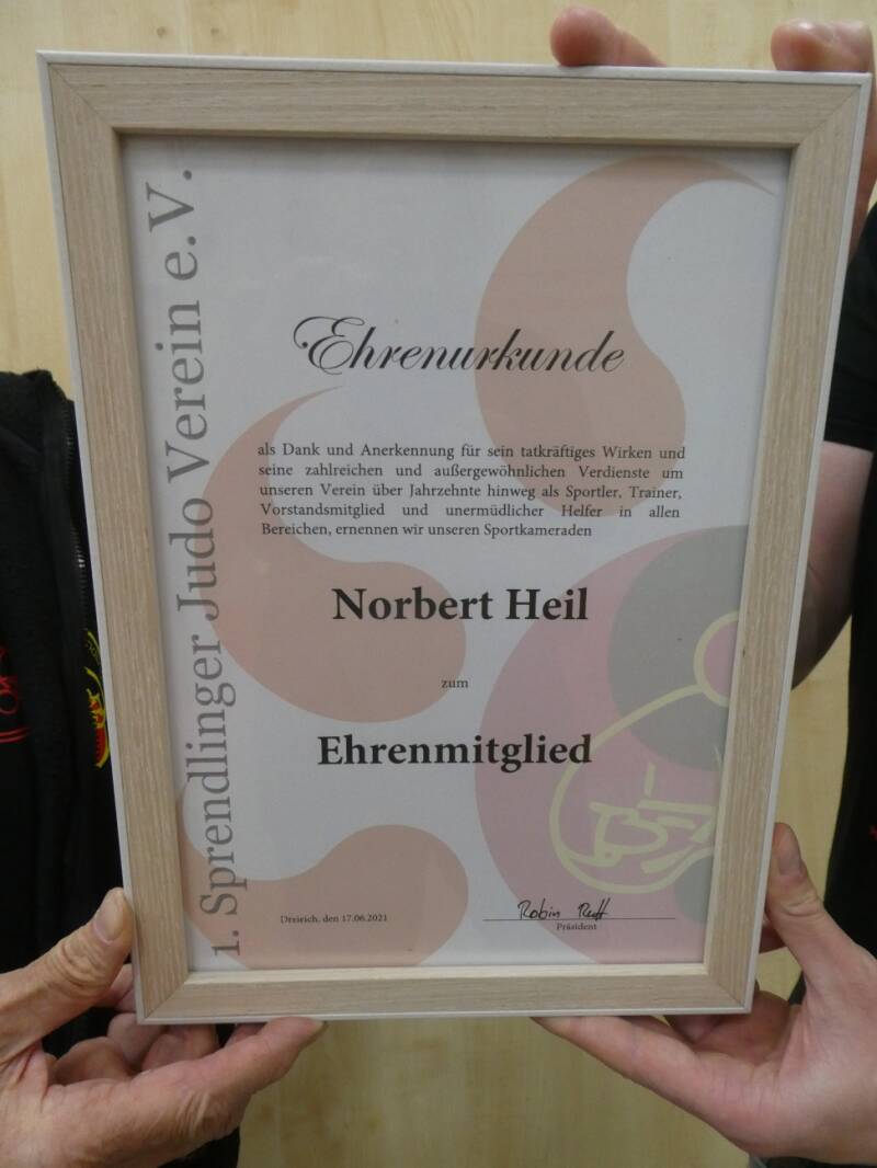 Auf Antrag des Vorstands wurde ihm die Ehrenmitgliedschaft des 1. Sprendlinger Judo Verein e.V. verliehen. Dies wurde angeregt, um seine langjährige und hoch engagierte Arbeit in unserem Verein zu würdigen. Norbert ist seit 1986 Vereinsmitglied und war lange Jahre in den Bereichen Ju-Jutsu, Judo und Selbstverteidigung für Aus- und Weiterbildung verantwortlich. Auch heute steht er noch 3 Mal pro Woche als Trainer auf der Matte. Nicht zuletzt war er über 10 Jahre der 1. Vorsitzende unseres Vereins. Durch verschiedene Aktivitäten wie Ausflüge, Grillfeste und Weihnachtsfeiern sorgt Norbert für gesellige Stunden neben dem Training und stärkt das Gemeinschaftsgefühl in der Gruppe.